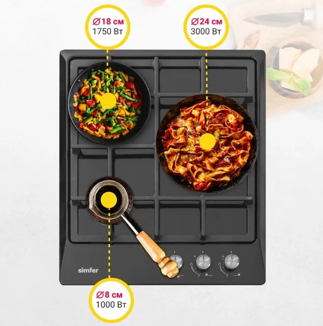 Мощность конфорок: 1 х большая конфорка 3000 Вт. 1 х стандартная конфорка 1750 Вт. 1 x экономичная конфорка 1000 Вт. Материал решеток - чугун. Вы сможете выбрать оптимальную конфорку для приготовления разнообразных блюд. Для удобного пользования в поворотные переключатели встроен электроподжиг, который значительно упрощает работу с панелью. Начните готовить изысканные блюда вместе с варочной панелью Simfer!