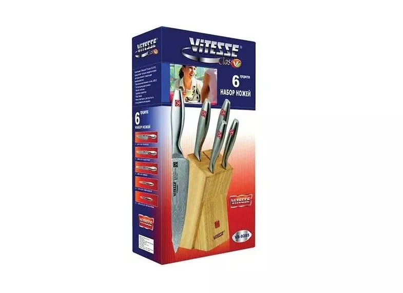 ViTESSE представляет Вам новый набор VS-9205, состоящий из 5 ножей и деревянной подставки. Все предметы изготовлены из высокоуглеродистой нержавеющей стали. Состав материала обеспечивает повышенную прочность и хорошую податливость ножа к заточке. Кроме того, в углеродистую сталь добавлен молибден для придания изделиям антикоррозийных свойств. Острая режущая кромка, удобная рукоятка и легкая заточка ножей ViTESSE VS-9205 доставят удовольствие владельцу набора!