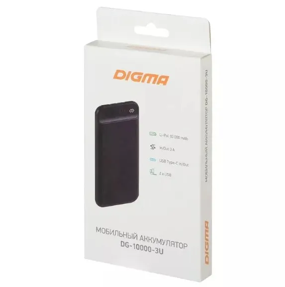 Внешний аккумулятор Digma DG-10000-3U предназначен для портативной зарядки смартфонов и планшетов. Оснащён индикатором уровня заряда батареи. Благодаря компактным размерам его можно взять с собой куда угодно. Аккумулятор имеет 3 USB-разъёма и позволяет заряжать устройства с силой тока 3 A.