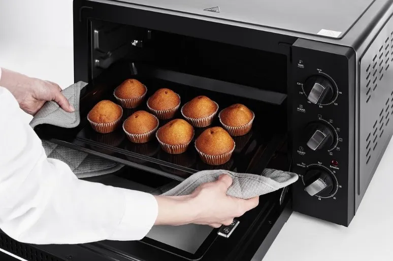 Объём рабочей камеры в 42 литра позволяет готовить разные блюда одновременно на нескольких уровнях. Её антипригарное покрытие устойчиво к повреждениям, долговечно и значительно упрощает процесс последующей очистки.