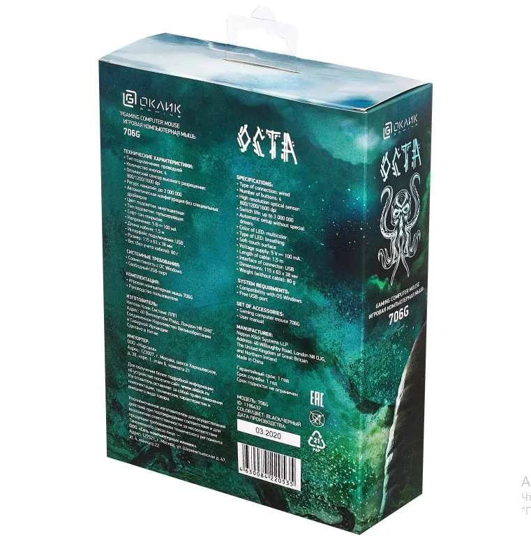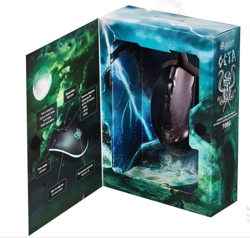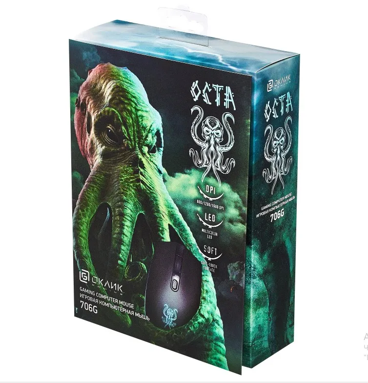 Oklick 706G OCTA – игровая 4-кнопочная мышь с тематическим подсвечивающимся значком на корпусе. Дизайнеры девайса вдохновлялись авторской мифологией Говарда Лавкрафта, создателя «Мифов Ктулху». Дополнительная многоцветная пульсирующая подсветка по бокам манипулятора создает захватывающую игровую атмосферу. Ресурс модели рассчитан на 3 млн кликов. Оптический сенсор имеет регулируемое разрешение, можно выбирать из значений 800, 1200 и 1600 dpi. Это позволяет использовать гаджет как для развлечений, так и для работы.